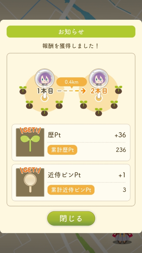指定した箇所と箇所の間の直線距離に応じて、ポイントがもらえるというもの。